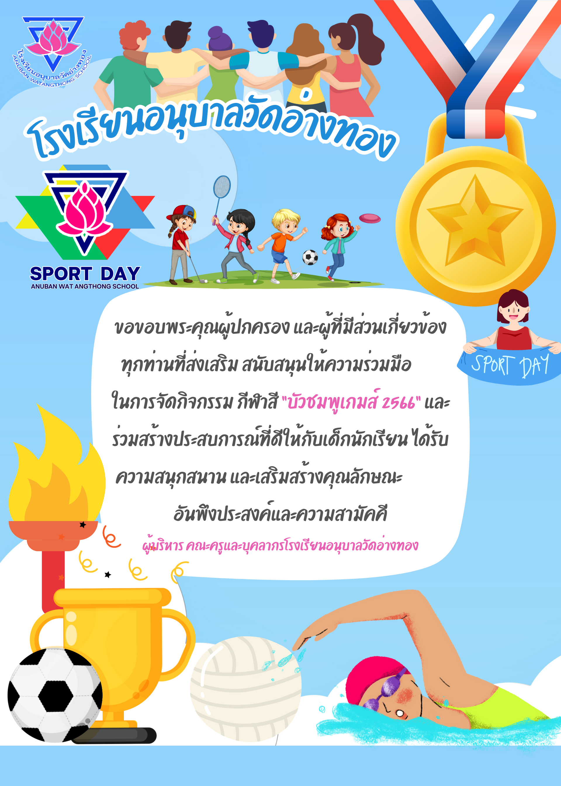 โรงเรียนอนุบาลวัดอ่างทอง ขอขอบคุณ ผู้ปกครองและผู้มีส่วนเกี่ยวข้องในการจัดงานกีฬาสี "บัวชมพูเกมส์" 2566