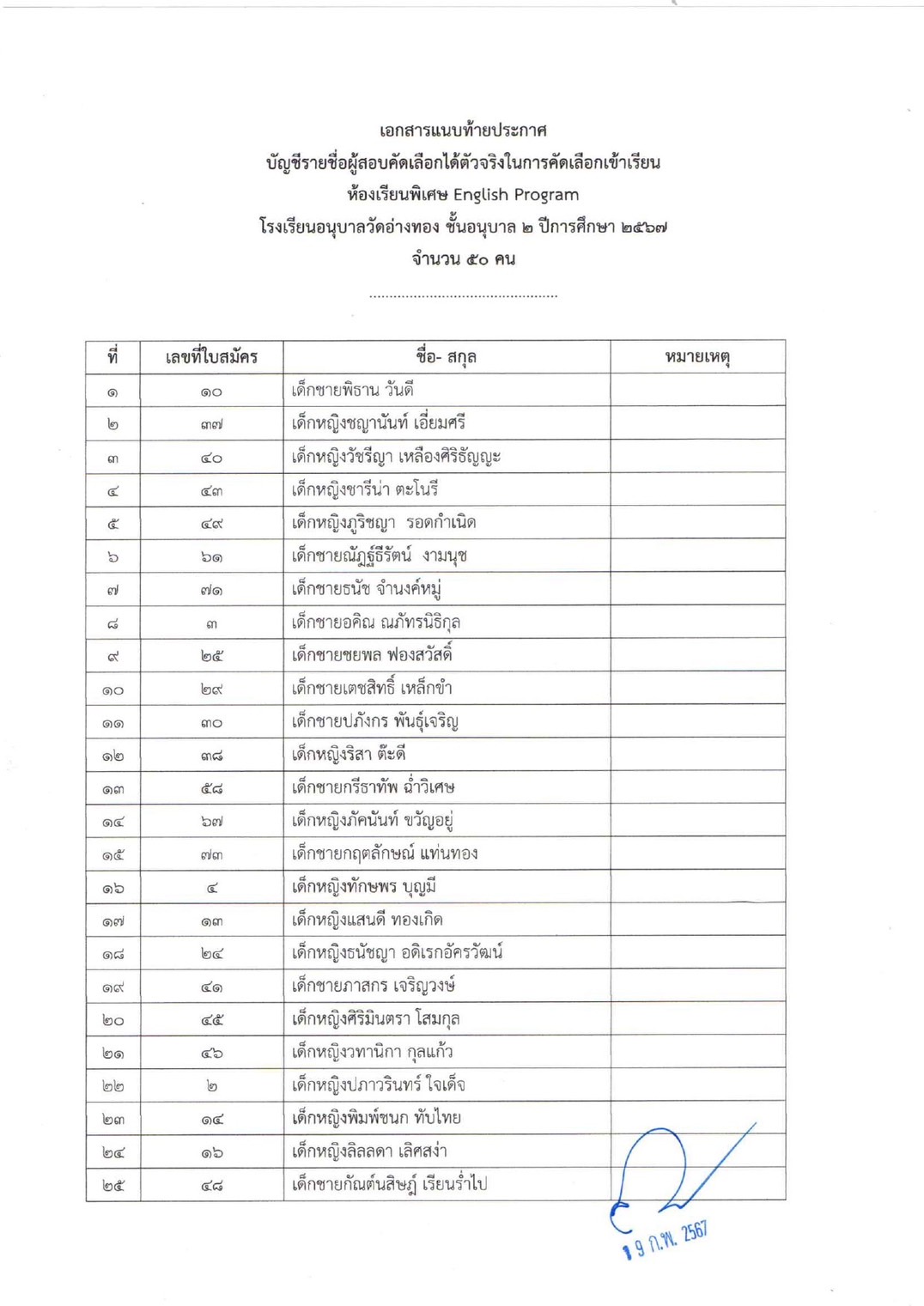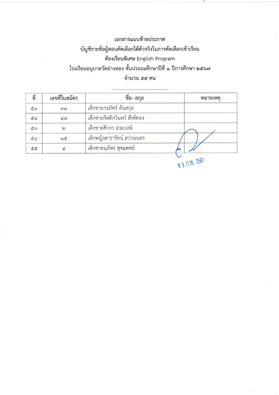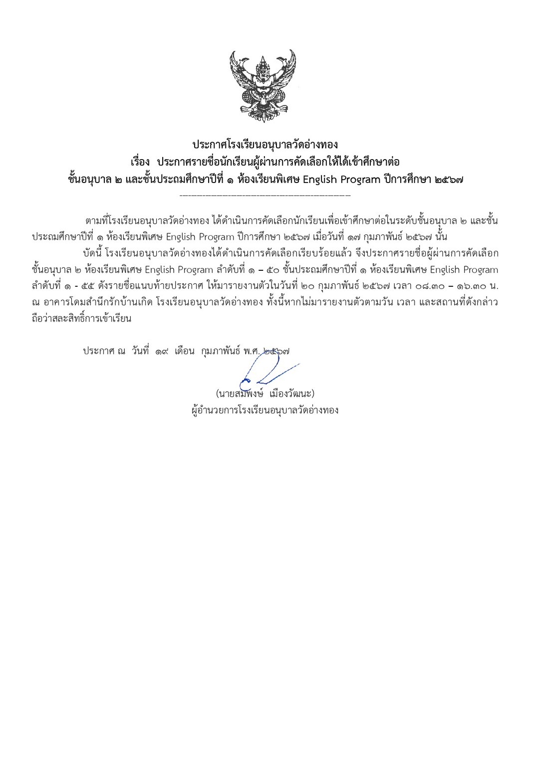 ประกาศรายชื่อนักเรียนผู้ผ่านการคัดเลือกให้ได้เข้าศึกษาต่อชั้นอนุบาล 2 และ ประถมศึกษาปีที่ 1 ห้องเรียน English Program ปีการศึกษา 2567