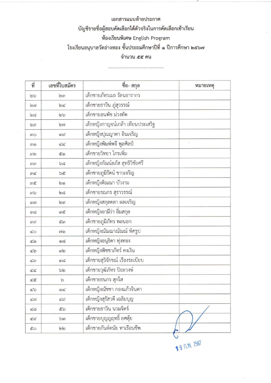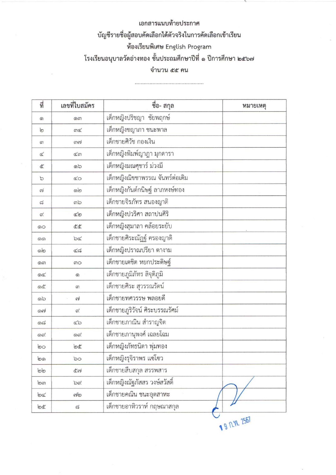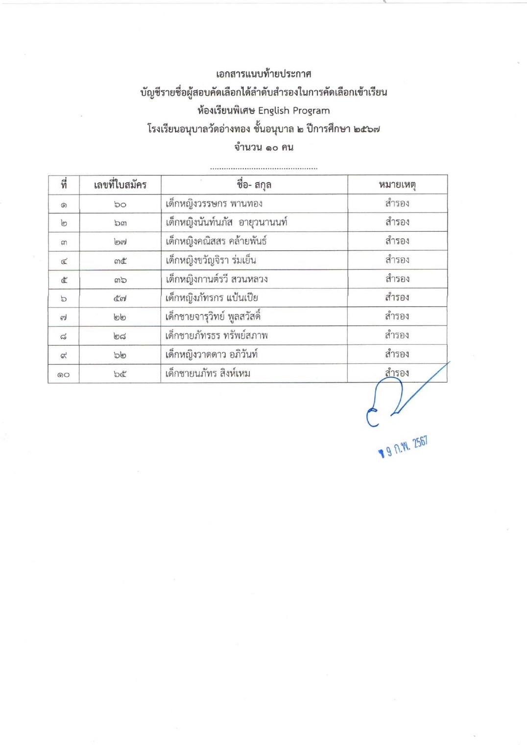 ประกาศรายชื่อนักเรียนผู้ผ่านการคัดเลือกให้ได้เข้าศึกษาต่อชั้นอนุบาล 2 และ ประถมศึกษาปีที่ 1 ห้องเรียน English Program ปีการศึกษา 2567