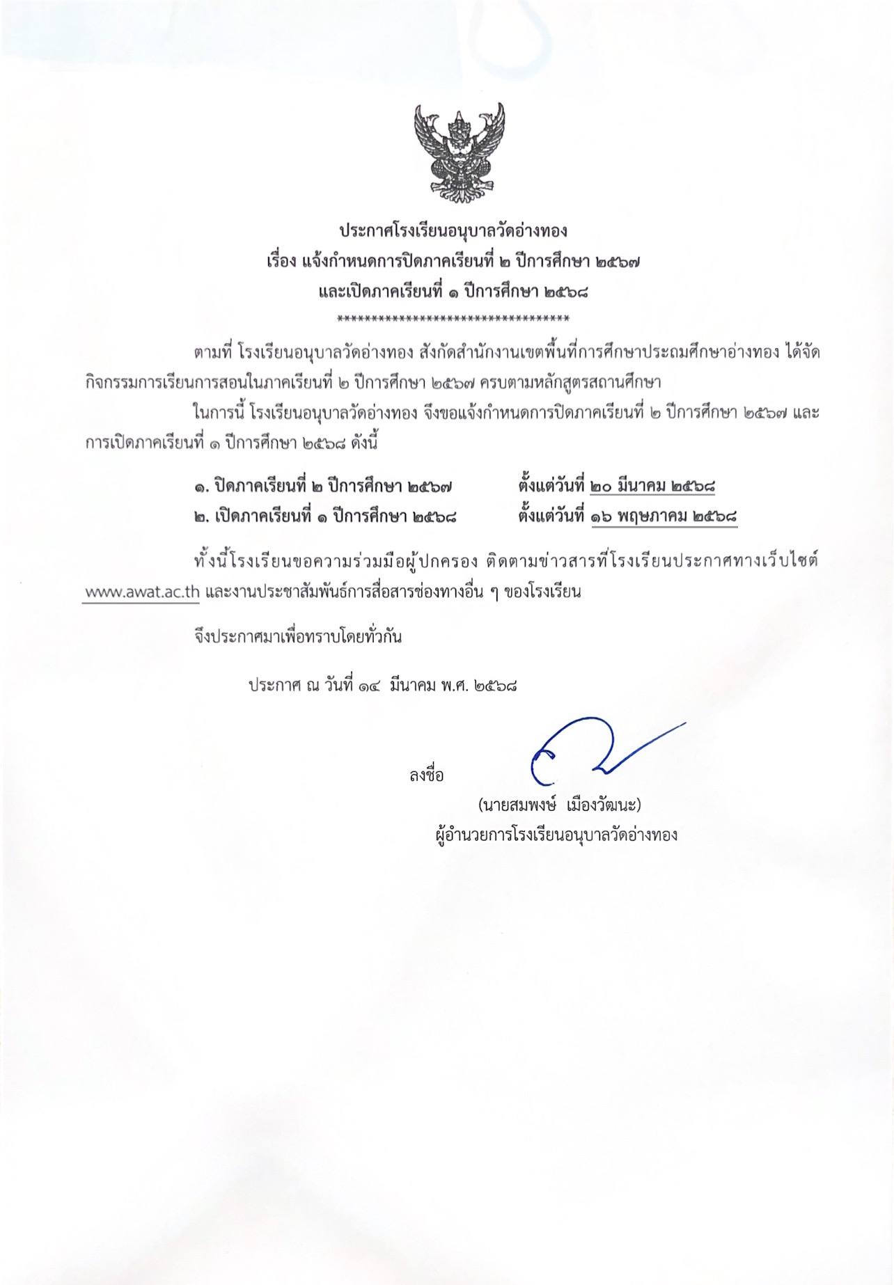 แจ้งกำหนดการปิดภาคเรียนที่ 2 ปีการศึกษา 2567 และเปิดภาคเรียนที่ 1 ปีการศึกษา 2568